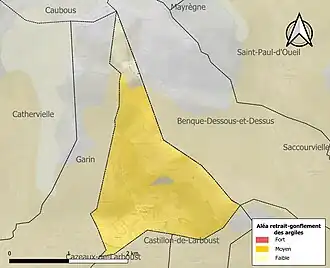 La commune est vulnérable au risque de mouvements de terrains constitué principalement du retrait-gonflement des sols argileux[26]. Cet aléa est susceptible d'engendrer des dommages importants aux bâtiments en cas d’alternance de périodes de sécheresse et de pluie. 90,1 % de la superficie communale est en aléa moyen ou fort (88,8 % au niveau départemental et 48,5 % au niveau national). Sur les 29 bâtiments dénombrés sur la commune en 2019, 29 sont en aléa moyen ou fort, soit 100 %, à comparer aux 98 % au niveau départemental et 54 % au niveau national. Une cartographie de l'exposition du territoire national au retrait gonflement des sols argileux est disponible sur le site du BRGM[27],[Carte 3].