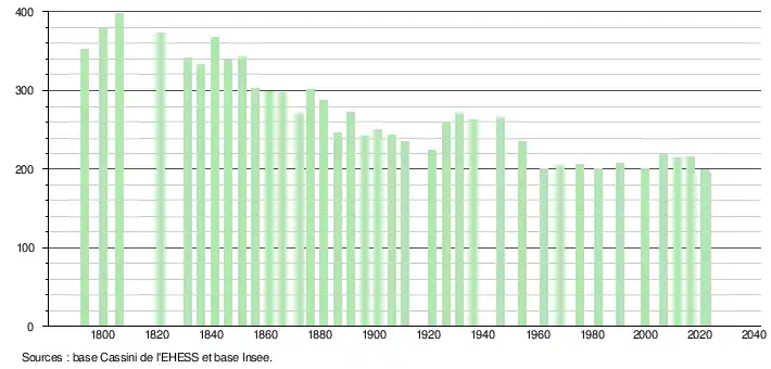 L'évolution du nombre d'habitants est connue à travers les recensements de la population effectués dans la commune depuis 1793. Pour les communes de moins de 10 000 habitants, une enquête de recensement portant sur toute la population est réalisée tous les cinq ans, les populations de référence des années intermédiaires étant quant à elles estimées par interpolation ou extrapolation[19]. Pour la commune, le premier recensement exhaustif entrant dans le cadre du nouveau dispositif a été réalisé en 2006[20].