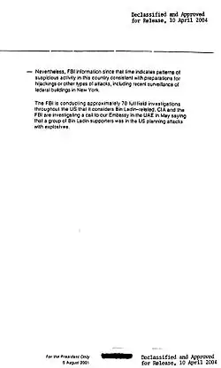 Celui du , intitulé Bin Ladin Determined To Strike in US, a été transmis par la CIA au président George W. Bush, qui était en vacances à Prairie Chapel, son ranch situé à Crawford au Texas[3].