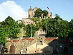 Le château Burg Klopp vu depuis une place de Bingen.