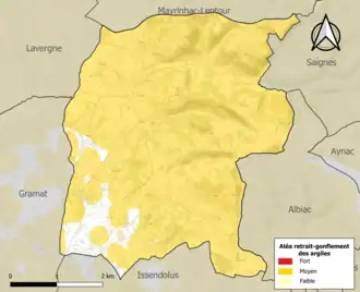 Le retrait-gonflement des sols argileux est susceptible d'engendrer des dommages importants aux bâtiments en cas d’alternance de périodes de sécheresse et de pluie. 93,3 % de la superficie communale est en aléa moyen ou fort (67,7 % au niveau départemental et 48,5 % au niveau national). Sur les 198 bâtiments dénombrés sur la commune en 2019, 191 sont en aléa moyen ou fort, soit 96 %, à comparer aux 72 % au niveau départemental et 54 % au niveau national. Une cartographie de l'exposition du territoire national au retrait gonflement des sols argileux est disponible sur le site du BRGM[31],[Carte 2].