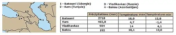 Cette topographie complexe induit une grande variété de climats. La carte et le tableau ci-contre montre bien cette grande variabilité de températures et de pluviométrie. En effet en comparant avec la carte du climat de Köppen on observe que cette région est une mosaïque de climats très différents. Au nord, au centre et au sud-ouest du Caucase on retrouve un climat continental humide. L'est et le notamment le sud-est possède un climat semi-aride au bord de la mer Caspienne, alors que la façade ouest donnant sur la mer Noire est très pluvieuse et connaît un climat subtropical humide. Les Alpes pontiques supportent un climat continental, plutôt sec mais assez frais même en été.