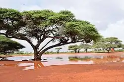 La partie occidentale de la région de Gambela, en dessous de 500 m, présente une végétation un peu différente. Elle est caractérisée par une strate d'herbes hautes qui brûlent chaque année, et une canopée d'arbres qui tolèrent à la fois le feu et les inondations récurrentes. Elle correspond à la continuation, à l'intérieur de l'Éthiopie, de la vaste « région des crues » de la partie supérieure de la vallée du Nil au Soudan et au Soudan du Sud. Dans ces pays, les arbres disparaissent néanmoins à mesure que l'on se rapproche des zones de forte inondation, et les formations herbeuses boisées sont remplacées par de vastes marécages. Au Gambela, la strate arborée est dominée par les espèces d'Acacia, en particulier Acacia seyal et Acacia nilotica. Les palmiers Hyphaene thebaica et Borassus aethiopum peuvent également être présents, seuls ou ensemble. Dans les zones les plus inondées, on trouve des populations presque pures d'Oryza, en particulier Oryza longistaminata, ainsi que des herbes tolérant l'humidité, comme Caperonia serrata ou Thalia geniculata[24].