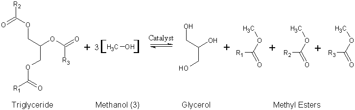 Pour augmenter la vitesse de réaction, il faut chauffer le liquide vers 50 °C et ajouter une base comme catalyseur (catalyse homogène : catalyseurs solubles dans le milieu réactionnel tels que l'hydroxyde de sodium en solution méthanoïque ou le méthylate de sodium[11] ; catalyse hétérogène : catalyseurs insolubles dans le milieu réactionnel[12]). Pour un meilleur rendement énergétique global, on peut aussi choisir de laisser simplement réagir sans chauffer, la réaction prenant alors quelques heures. Il faut approximativement 100 kg de méthanol pour transestérifier une tonne d'huile végétale (ester d'acides gras et de glycérol) de colza en présence d'un catalyseur alcalin[13]. On obtient alors une tonne de diester (ester d'acides gras et de méthanol) et 100 kg de glycérine réutilisable dans l'industrie chimique ou alimentaire.