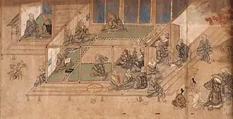 - Hōnen est rassemblé avec ses disciples ; Shinran préside un débat sur la primauté entre la foi et la pratique