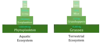 En milieu aérien, la biomasse des producteurs primaires est souvent très supérieure à la biomasse des consommateurs, tout particulièrement dans les forêts où une grande partie de la biomasse est constituée de bois. Dans les milieux aquatiques et tout particulièrement océaniques, la biomasse des producteurs primaires (phytoplancton) est en général plus faible que celle des consommateurs, mais cette biomasse se renouvelle rapidement[22].