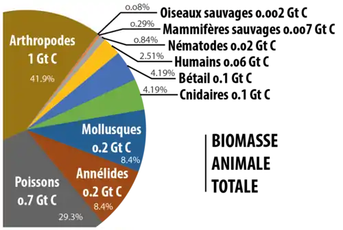 - L'essentiel de la biomasse des plantes est terrestre. À l’inverse, la biomasse animale est essentiellement marine tandis que le monde microbien se concentre dans les environnements profonds (sédiments marins et croûte en milieu océanique, sol et subsurface en milieu continental[8].