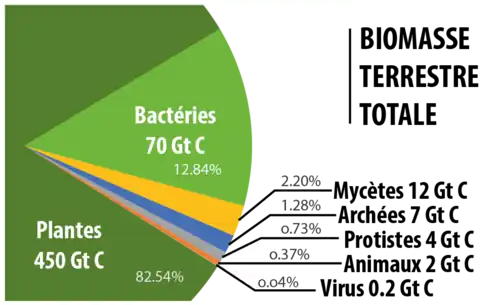 - Contrairement à une idée largement répandue qui veut que la masse globale de tous les organismes vivant dans l'eau, l'air et le sol, soit majoritairement représenté par des êtres « visibles » de la planète, la distribution de la biomasse sur terre est, selon une méta-analyse de plusieurs centaines de publications, pour moitié consacrée aux êtres « visibles » et pour moitié aux êtres « invisibles »[8] (bactéries et champignons microscopiques qui constituent l'essentiel de la biodiversité du sol, et surtout les racines qui représentent en moyenne un tiers de la biomasse des plantes)[9]. La biomasse végétale — composée des racines souterraines[10] et des plantes « visibles[11] » en surface — constitue plus de 80 % de la biomasse à la surface de la terre[12]. La masse globale des plantes « visibles » représente 50 % de la biomasse totale à la surface du globe aujourd'hui[13], sachant que la biomasse végétale est cent fois plus importante que la biomasse animale « visible » et constitue la première source de matière organique carbonée de la planète (500 milliards de tonnes de matière sèche)[14],[15]. Cette diversité ne prend pas en compte la biomasse virale qui représenterait 90 % du carbone organique présent dans les océans, le nombre de virus sur terre étant estimé à 1031[16].