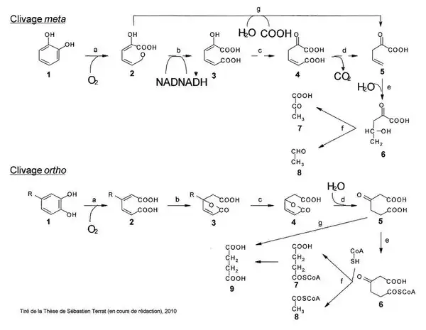 Ces voies peuvent être différenciées par le positionnement des oxygènes apportés par la dioxygénase qui vont cliver le cycle aromatique.