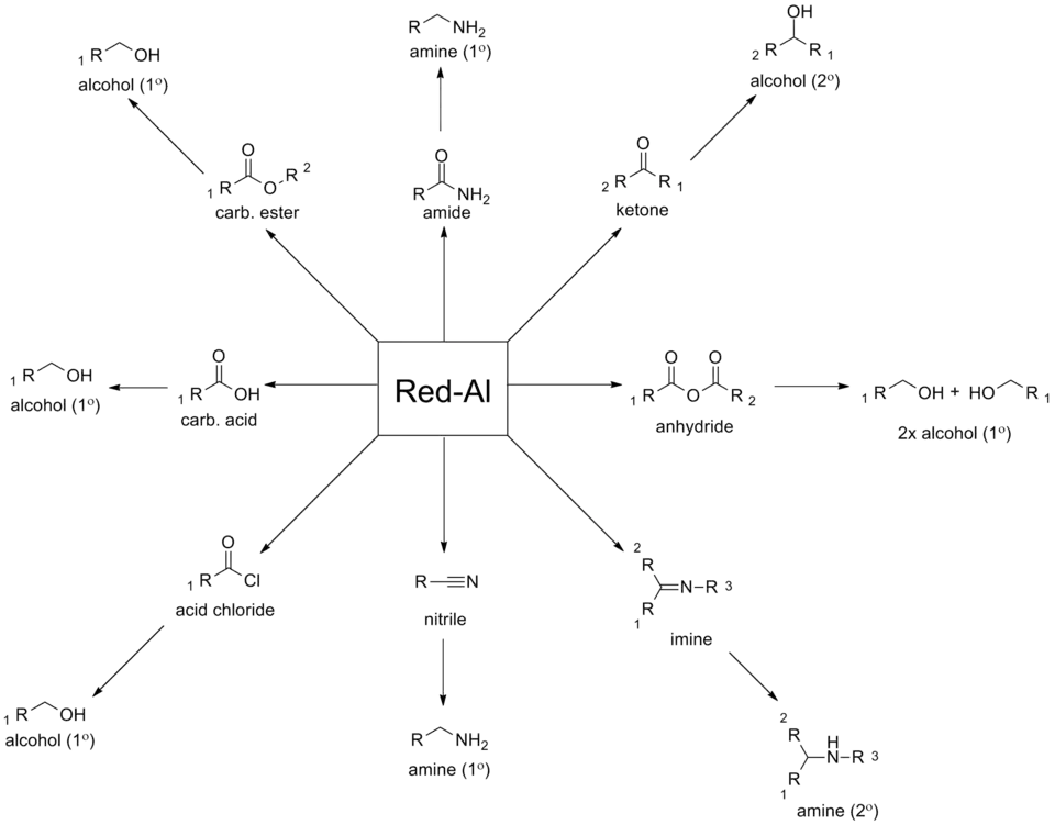 Le Red-Al est un réducteur polyvalent. Il convertit facilement les aldéhydes, les cétones, les acides carboxyliques, les esters, les halogénures d'acyle et les anhydrides en alcools primaires. Les composés cycliques comme les lactones et les époxydes sont réduits en diols. Les dérivés azotés comme les amides, les nitriles, les imines et la plupart des molécules azotées sont réduites en amines correspondantes. Les nitroarènes peuvent être convertis en azoxyarènes, azoarènes ou hydroazoarènes selon les conditions de réaction[3]. La planche ci-dessous résume les principales réactions de réduction réalisées avec le Red-Al :