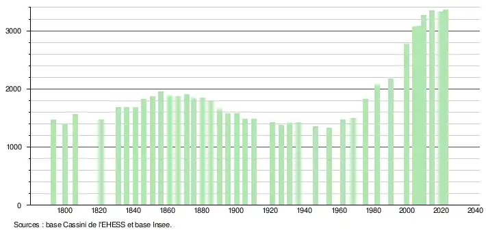 L'évolution du nombre d'habitants est connue à travers les recensements de la population effectués dans la commune depuis 1793. Pour les communes de moins de 10 000 habitants, une enquête de recensement portant sur toute la population est réalisée tous les cinq ans, les populations de référence des années intermédiaires étant quant à elles estimées par interpolation ou extrapolation[22]. Pour la commune, le premier recensement exhaustif entrant dans le cadre du nouveau dispositif a été réalisé en 2004[23].