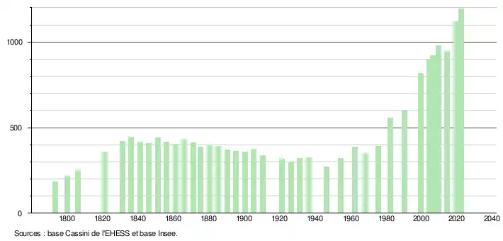 L'évolution du nombre d'habitants est connue à travers les recensements de la population effectués dans la commune depuis 1793. Pour les communes de moins de 10 000 habitants, une enquête de recensement portant sur toute la population est réalisée tous les cinq ans, les populations de référence des années intermédiaires étant quant à elles estimées par interpolation ou extrapolation[21]. Pour la commune, le premier recensement exhaustif entrant dans le cadre du nouveau dispositif a été réalisé en 2004[22].