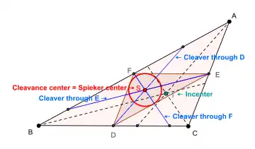 Les trois cleavers se croisent au centre du cercle de Spieker du triangle[1],[2].
