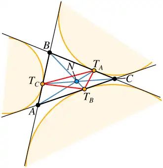 L'autre extrémité du segment splitter se trouve sur le côté du triangle où un des cercles exinscrits du triangle est tangent à ce côté[1],[2]. Ce point est aussi appelé un point séparateur du triangle[2]. Elle est aussi un sommet du triangle de Nagel et un des points où l'ellipse inscrite de Mandart est tangente au côté du triangle[3].