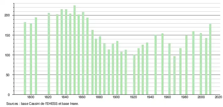 - ↑ Par convention dans Wikipédia, le principe a été retenu de n’afficher dans le tableau des recensements et le graphique, pour les populations légales postérieures à 1999, que les populations correspondant à une enquête exhaustive de recensement pour les communes de moins de 10 000 habitants, et que les populations des années 2006, 2011, 2016, etc. pour les communes de plus de 10 000 habitants, ainsi que la dernière population légale publiée par l’Insee pour l'ensemble des communes.