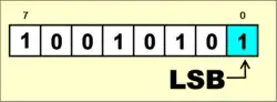 Exemple, pour un simple nombre en représentation binaire conventionnelle, le LSB est le bit le plus à droite : 01010110.