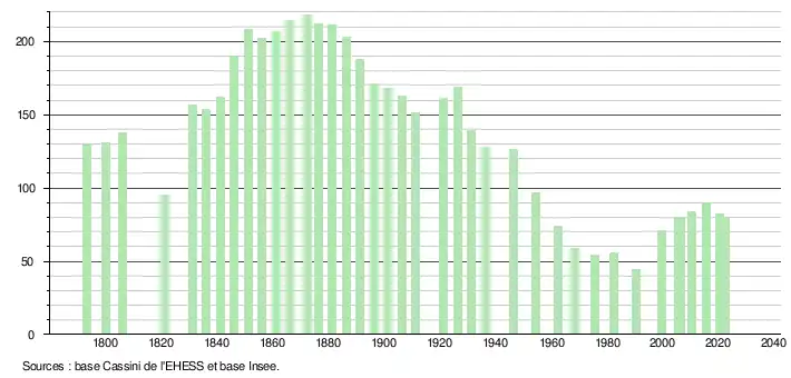 L'évolution du nombre d'habitants est connue à travers les recensements de la population effectués dans la commune depuis 1793. Pour les communes de moins de 10 000 habitants, une enquête de recensement portant sur toute la population est réalisée tous les cinq ans, les populations de référence des années intermédiaires étant quant à elles estimées par interpolation ou extrapolation[15]. Pour la commune, le premier recensement exhaustif entrant dans le cadre du nouveau dispositif a été réalisé en 2005[16].