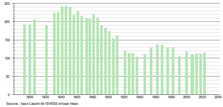 L'évolution du nombre d'habitants est connue à travers les recensements de la population effectués dans la commune depuis 1793. Pour les communes de moins de 10 000 habitants, une enquête de recensement portant sur toute la population est réalisée tous les cinq ans, les populations de référence des années intermédiaires étant quant à elles estimées par interpolation ou extrapolation[13]. Pour la commune, le premier recensement exhaustif entrant dans le cadre du nouveau dispositif a été réalisé en 2007[14].