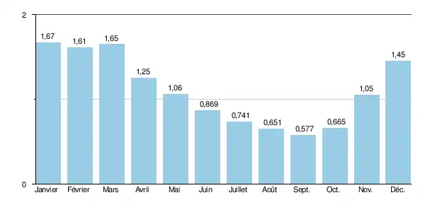 Son débit moyen interannuel que l'on appelle aussi module est de 1,1 m3/s.