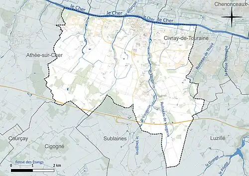 Le Cher, d'une longueur totale de 365,5 km, prend sa source à 714 mètres d'altitude à Mérinchal, dans la Creuse et se jette dans la Loire à Villandry, à 40 m d'altitude, après avoir traversé 117 communes[3]. Il constitue la limite séparative nord de la commune. Le Cher présente des fluctuations saisonnières de débit assez marquées. Sur le plan de la prévision des crues, la commune est située dans le tronçon du Cher tourangeau[4], dont la station hydrométrique de référence la plus proche est située à Tours [Pont Saint Sauveur]. Le débit mensuel moyen (calculé sur 53 ans pour cette station) varie de 25,8 m3/s au mois à 192 m3/s au mois de février. Le débit instantané maximal observé sur cette station est de 1 000 m3/s le , la hauteur maximale relevée a été de 4,96 m le [5],[6]. Ce cours d'eau est classé dans les listes 1[Note 1] et 2[Note 2] au titre de l'article L. 214-17 du code de l'environnement sur le Bassin Loire-Bretagne. Au titre de la liste 1, aucune autorisation ou concession ne peut être accordée pour la construction de nouveaux ouvrages s'ils constituent un obstacle à la continuité écologique et le renouvellement de la concession ou de l'autorisation des ouvrages existants est subordonné à des prescriptions permettant de maintenir le très bon état écologique des eaux. Au titre de la liste 2, tout ouvrage doit être géré, entretenu et équipé selon des règles définies par l'autorité administrative, en concertation avec le propriétaire ou, à défaut, l'exploitant[7],[8]. Sur le plan piscicole, le Cher est classé en deuxième catégorie piscicole. Le groupe biologique dominant est constitué essentiellement de poissons blancs (cyprinidés) et de carnassiers (brochet, sandre et perche)[9].