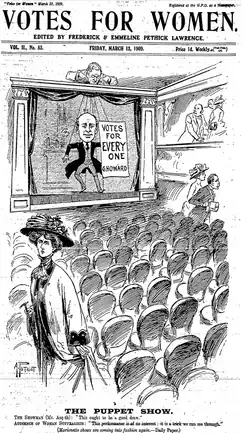 Première page de Votes for Women montrant une caricature d'Asquith offrant un suffrage plus large, une proposition dédaigné par les suffragettes[17].