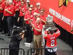 Les Blackhawks éliminent ensuite les Canucks de Vancouver 4 à 2 pour retrouver les Sharks en finale d'association[96]. Ils remportent les deux premiers matchs 2-1 et 4-2 à San José puis le troisième à Chicago, 3-2 en prolongation ; le , ils battent à nouveau les Sharks 4 buts à 2 et remportent la série 4 victoires à 0. Ils se qualifient ainsi pour la 11e finale de la Coupe Stanley de leur histoire. Confrontés aux Flyers de Philadelphie, ils remportent leurs deux premiers matchs à domicile avant de perdre deux fois chez les Flyers. Ils remportent le 5e match, à nouveau à Chicago[97]. Lors du 6e match, disputé à Philadelphie, une prolongation est disputée lors de laquelle, après un peu plus de 4 minutes de jeu, Patrick Kane, marque le but qui donne la victoire et la quatrième coupe Stanley de l'histoire de la franchise, 49 ans après la précédente. À titre individuel, Jonathan Toews remporte le trophée Conn-Smythe du meilleur joueur des séries éliminatoires[98]. En décrochant la coupe Stanley, il devient membre du Club Triple Or des joueurs ayant remporté à la fois le championnat du monde, les Jeux olympiques et la coupe Stanley[99].