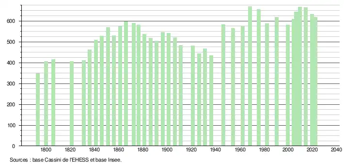 L'évolution du nombre d'habitants est connue à travers les recensements de la population effectués dans la commune depuis 1793. Pour les communes de moins de 10 000 habitants, une enquête de recensement portant sur toute la population est réalisée tous les cinq ans, les populations de référence des années intermédiaires étant quant à elles estimées par interpolation ou extrapolation[22]. Pour la commune, le premier recensement exhaustif entrant dans le cadre du nouveau dispositif a été réalisé en 2004[23].
