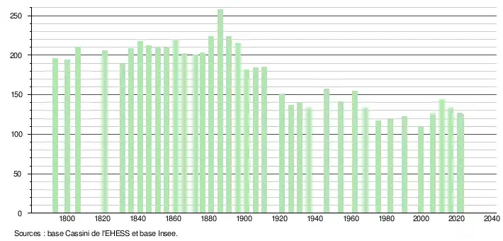 L'évolution du nombre d'habitants est connue à travers les recensements de la population effectués dans la commune depuis 1793. Pour les communes de moins de 10 000 habitants, une enquête de recensement portant sur toute la population est réalisée tous les cinq ans, les populations de référence des années intermédiaires étant quant à elles estimées par interpolation ou extrapolation[12]. Pour la commune, le premier recensement exhaustif entrant dans le cadre du nouveau dispositif a été réalisé en 2006[13].