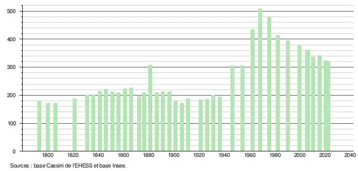 L'évolution du nombre d'habitants est connue à travers les recensements de la population effectués dans la commune depuis 1793. Pour les communes de moins de 10 000 habitants, une enquête de recensement portant sur toute la population est réalisée tous les cinq ans, les populations de référence des années intermédiaires étant quant à elles estimées par interpolation ou extrapolation[28]. Pour la commune, le premier recensement exhaustif entrant dans le cadre du nouveau dispositif a été réalisé en 2005[29].