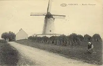 La construction du moulin d'Ostiches remonte à 1789, lorsque Jean-Baptiste Deltenre, censier, obtient l'octroi indispensable pour l'établir sur les hauteurs du village d’Ostiches (altitude : 50 mètres), au lieu-dit Pidebecq. Les descendants de la famille Deltenre demeurent propriétaires du moulin jusqu'au XXe siècle et en assurent le bon fonctionnement.