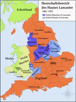 Le titre de duc de Lancastre disparaît lorsque Henri de Grosmont succombe à la peste le 23 mars 1361. Les baronnies qu'il a possédées retournent à la couronne, tandis que ses comtés sont partagés entre ses deux filles. En juillet 1361, des négociations ont lieu au sujet du partage de l'héritage du duc et aboutissent à un accord entre les deux sœurs. Maud de Lancastre obtient essentiellement des terres situées à l'ouest de l'Angleterre, notamment dans le Gloucestershire, le Herefordshire, le Leicestershire et les Marches galloises, ainsi que le titre de comtesse de Leicester. Quant à Blanche, une grande partie de son héritage est situé au nord de la rivière Trent, dans le Lancashire, le Nottinghamshire, le Staffordshire et le Cheshire, et comprend les comtés de Derby et de Lancastre. Pourtant, il semble que Blanche n'ait porté que le titre de comtesse de Derby, celui de Lancastre étant tombé en désuétude depuis 1351[11],[12].