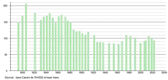 L'évolution du nombre d'habitants est connue à travers les recensements de la population effectués dans la commune depuis 1793. Pour les communes de moins de 10 000 habitants, une enquête de recensement portant sur toute la population est réalisée tous les cinq ans, les populations de référence des années intermédiaires étant quant à elles estimées par interpolation ou extrapolation[38]. Pour la commune, le premier recensement exhaustif entrant dans le cadre du nouveau dispositif a été réalisé en 2008[39].