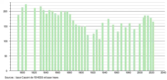 L'évolution du nombre d'habitants est connue à travers les recensements de la population effectués dans la commune depuis 1793. Pour les communes de moins de 10 000 habitants, une enquête de recensement portant sur toute la population est réalisée tous les cinq ans, les populations de référence des années intermédiaires étant quant à elles estimées par interpolation ou extrapolation[32]. Pour la commune, le premier recensement exhaustif entrant dans le cadre du nouveau dispositif a été réalisé en 2008[33].
