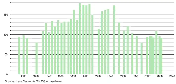 L'évolution du nombre d'habitants est connue à travers les recensements de la population effectués dans la commune depuis 1793. Pour les communes de moins de 10 000 habitants, une enquête de recensement portant sur toute la population est réalisée tous les cinq ans, les populations de référence des années intermédiaires étant quant à elles estimées par interpolation ou extrapolation[24]. Pour la commune, le premier recensement exhaustif entrant dans le cadre du nouveau dispositif a été réalisé en 2004[25].