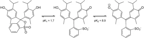 Le bleu de thymol comporte deux radicaux hydroxyl et un cycle sultone moins stable. En solution aqueuse, ce cycle est hydrolysé et les cristaux donnent une solution quinoïde jaunâtre. En solution fortement acide (pH < 1,2), cette forme quinoïde, protonisée, prend une teinte rouge ; en milieu alcalin (pH = 8,0–9,6), au contraire, le radical hydroxyl est déprotonisé et la solution prend une teinte bleue.