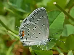 Le revers est gris pâle un peu suffusé de bleu et orné de petits points noirs cernés de blanc et aux postérieures un à trois chevrons orange submarginales proches de la queue.