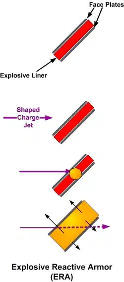 Le principe du blindage réactif explosif (ou ERA, en anglais : Explosive Reactive Armor) est celui d'un assemblage de trois couches (ou sandwich) incliné à plus de 25°[4] et formé par deux plaques d'acier emprisonnant une couche d’explosif[4] (ou feuillet). Quand le dard formé par l'explosion d'une charge creuse percute le sandwich, il déclenche la détonation de l'explosif, ce qui met en mouvement les deux plaques d'acier, qui s’éloignent alors l’une de l’autre à très haute vitesse. Ce faisant, tout se passe comme si le dard de charge creuse voyait défiler devant lui une plaque d'acier qu'il découpe à la manière d'une scie sauteuse avec une planche de bois[5]. Cette découpe consomme le dard et le fractionne, ce qui réduit sa capacité de pénétration.