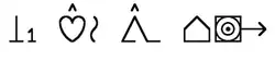 Dans l'exemple des verbes, les petites marques au-dessus des mots sont des déterminatifs. Ces marques grammaticales permettent, à la manière des déterminatifs utilisés dans les hiéroglyphes égyptiens, de désigner la classe grammaticale d'un symbole (verbe, nom, adjectif) ou de préciser le champ lexical auquel il appartient.