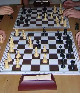 Il est aussi possible de jouer avec deux joueurs sur deux échiquiers. Parfois, on n'utilise alors qu'une seule pendule et on force une alternance particulière des coups (joueur A avec les Blancs, puis joueur B avec les Blancs, puis joueur A Noirs et joueur B Noirs).