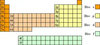 - ( ** ) Le cas du nickel 28Ni est particulier : il présente deux configurations électroniques d'énergies très voisines qui se recouvrent. Les manuels retiennent généralement la configuration régulière [Ar] 3d8 4s2, étayée par les données expérimentales. Mais la moyenne des niveaux d'énergie correspondant à la configuration irrégulière [Ar] 3d9 4s1 est légèrement inférieure à celle de la configuration régulière, de sorte qu'on retient également la configuration irrégulière pour les calculs sur le nickel.