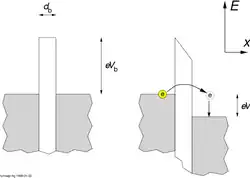 En raison de la nature discrète de la charge électrique, le courant à travers une jonction tunnel est une série d'événements dans lesquels exactement un électron passe (tunnels) à travers la barrière de potentiel (nous négligeons le cotunneling, dans lequel deux électrons traversent simultanément). Ainsi, sous ces restrictions, le condensateur de jonction tunnel est chargé d'une seule charge élémentaire par l'électron tunnel, provoquant une tension , où est la charge élémentaire de et la capacité de la jonction. Si la capacité est très petite, la différence de tension peut être suffisamment importante pour empêcher un autre électron de traverser par effet tunnel. Le courant électrique est ensuite supprimé à de faibles tensions et la résistance du dispositif n'est plus constante. L'augmentation de la résistance différentielle autour d'une différence de potentiel de zéro s'appelle le blocage de Coulomb.