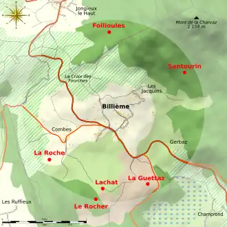 Le site de Follioules se situe dans l'actuelle commune de Jongieux, et les cinq autres sur le territoire de Billième (dont les blocs cupulaires de La Roche).