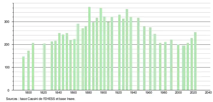 L'évolution du nombre d'habitants est connue à travers les recensements de la population effectués dans la commune depuis 1793. Pour les communes de moins de 10 000 habitants, une enquête de recensement portant sur toute la population est réalisée tous les cinq ans, les populations de référence des années intermédiaires étant quant à elles estimées par interpolation ou extrapolation[31]. Pour la commune, le premier recensement exhaustif entrant dans le cadre du nouveau dispositif a été réalisé en 2007[32].