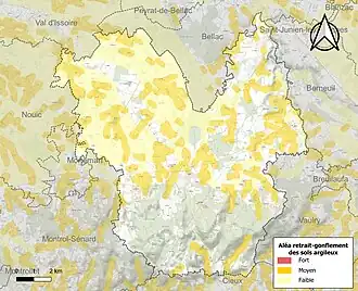 Le retrait-gonflement des sols argileux est susceptible d'engendrer des dommages importants aux bâtiments en cas d’alternance de périodes de sécheresse et de pluie[20]. Ainsi, 27,4 % de la superficie communale est en aléa moyen ou fort (27 % au niveau départemental et 48,5 % au niveau national métropolitain)[Carte 2]. Depuis le , en application de la loi ÉLAN, différentes contraintes s'imposent aux vendeurs, maîtres d'ouvrages ou constructeurs de biens situés dans une zone classée en aléa moyen ou fort[Note 2],[21].