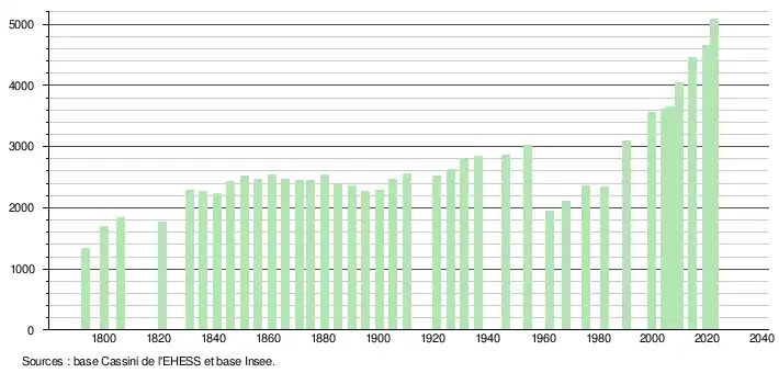 L'évolution du nombre d'habitants est connue à travers les recensements de la population effectués dans la commune depuis 1793. Pour les communes de moins de 10 000 habitants, une enquête de recensement portant sur toute la population est réalisée tous les cinq ans, les populations de référence des années intermédiaires étant quant à elles estimées par interpolation ou extrapolation[29]. Pour la commune, le premier recensement exhaustif entrant dans le cadre du nouveau dispositif a été réalisé en 2004[30].