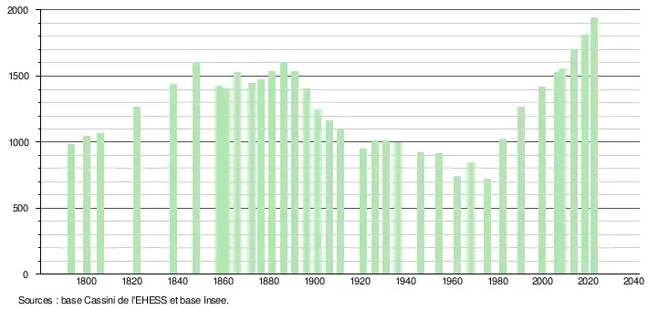 L'évolution du nombre d'habitants est connue à travers les recensements de la population effectués dans la commune depuis 1793. Pour les communes de moins de 10 000 habitants, une enquête de recensement portant sur toute la population est réalisée tous les cinq ans, les populations de référence des années intermédiaires étant quant à elles estimées par interpolation ou extrapolation[28]. Pour la commune, le premier recensement exhaustif entrant dans le cadre du nouveau dispositif a été réalisé en 2008[29].