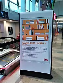 La SNCF a mis en place, dans les salles d'attente de ses gares, un système d'échange de livre baptisé Gare aux livres. Cette opération a été lancée en collaboration avec le secours populaire français[26].