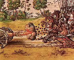 La boîte à mitraille (ou biscaïen) était utilisée comme projectile pour les canons dans les batailles rangées jusqu'aux guerres napoléoniennes. Il s'agit d'un cylindre rempli de balles de plomb que l'artilleur glissait dans le fût du canon. Au moment du tir, les balles étaient violemment éjectées et fusaient par centaines, causant d'énormes pertes dans les rangs des troupes visées. L'utilisation de la boîte à mitraille n'étant possible qu'à courte portée, les risques de perte du canon dans une mêlée étaient élevés.