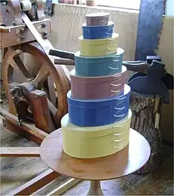 La boîte en bois cintré était à l'origine une boîte de travail pour le stockage d'objets secs, mais aujourd'hui, elle est davantage utilisée comme objet de décoration. Les Shakers utilisaient à l'origine les boîtes pour stocker les ingrédients de cuisine, les petits articles et les pièces pour le magasin. Elles se rangeaient facilement, car la plus petite pouvait être placée dans un plus grand vide, à la manière des poupées russes Matryoshka ; de nombreuses petites boîtes pouvaient être stockées dans l'espace de la plus grande. L'idée d'acheter un ensemble complet de sept ou huit boîtes de tailles graduées était un luxe hors de portée pour la plupart des ménages du XIXe siècle, chaque taille coûtant environ une journée de salaire, et les plus grandes davantage encore[1].