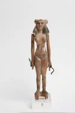 Une figurine en bois d'une femme nue et masquée a été trouvée dans la tombe. La figurine[1] était à l'origine peinte en jaune pour la peau et en noir pour les cheveux mais les couleurs se sont estompées. La femme tient deux serpents en métal dans ses mains. Ses bras sont des pièces séparées qui sont attachées par des chevilles. Elle porte un masque de lion et ressemble aux images des baguettes magiques. Il pourrait s'agir d'une référence au dieu Aha ou Beset. Il y a un petit trou sur son front, là où il y avait autrefois une sorte d'attache. La base de la figurine a été remodelée au cours de l'Antiquité[20]. Une découverte d'objets liés à la magie similaires à cette boîte a été faite à Kahun. Petrie a découvert un masque de Beset sur ce site, suggérant que des magiciens auraient pu prendre l'incarnation de cette déesse[10].